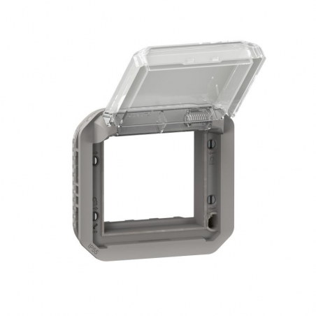 Description: Plexo adaptateur à volet transparent pour fonction Mosaic 2 modules - IP55 - IK07 - livré sans boîte de montage en surface ou cadre encastré gris