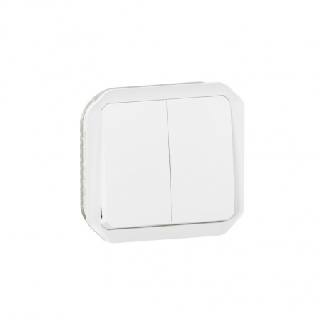 Description: Plexo double interrupteur deux directions ou poussoir inverseur - 250V - livré sans boîte de montage en surface ou cadre encastré - IP55 IK08 - blanc