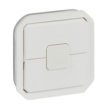 Description: Plexo double poussoir pour commande de volets roulants - 6A - 250V - livré sans boîte de montage en surface ou cadre encastré - IP55 IK06 - blanc