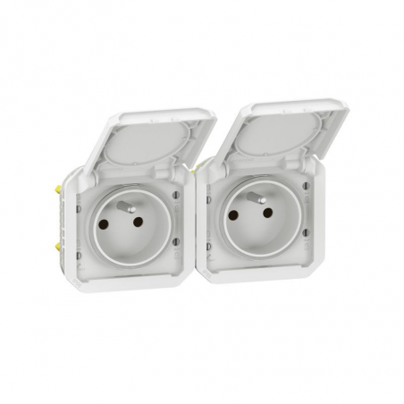 Description: Plexo prise de courant 16A - 250V - double précâblée avec bornes automatiques - 2 x 2P + T horizontal - livré sans boîte de montage en surface ou cadre encastré - blanc