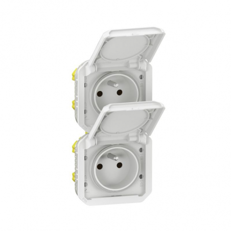 Description: Plexo prise de courant 16A - 250V - double précâblée avec bornes automatiques - 2 x 2P + T vertical - livré sans boîte de montage en surface ou cadre encastré IP55 IK08 - blanc