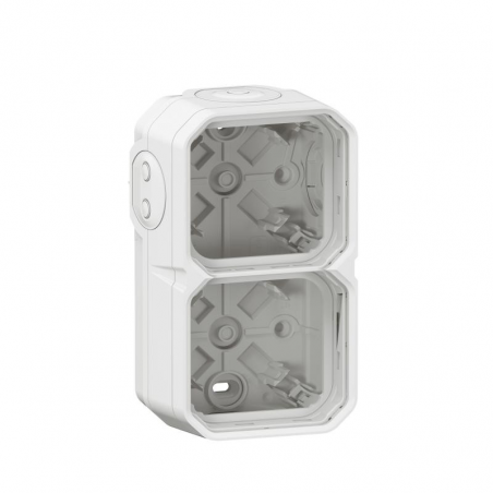Description: Plexo boîtier à embouts - 2 poste horizontaux ou verticaux - 3 entrées simple en 1 entrée double - embouts à membrane - IP55 IK08 - blanc