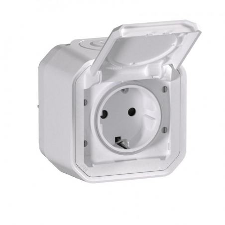 Description: Plexo prise de courant simple 16A 250V 2P + T - contact latéral de terre - avec bornes automatiques - complet avec boîte de montage - IP55 - IK08 - blanc