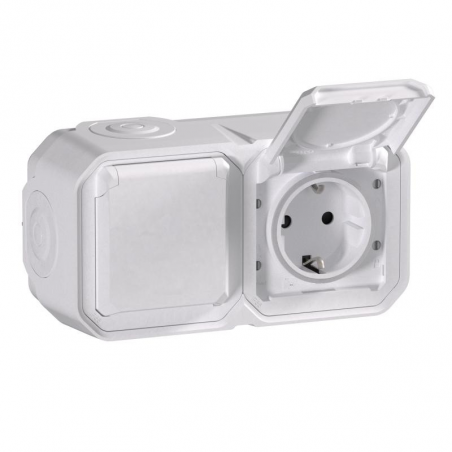 Description: Plexo prise de courant 16A - 2 x 2P + T contact latéral de terre - horizontal 250V - double précâblée avec bornes automatiques - complet avec boîte de montage - IP55 - IK08 - blanc