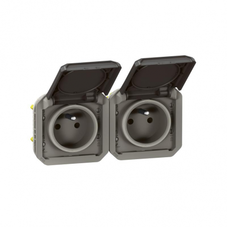 Description: Plexo prise de courant 16A - 250V - double précâblée avec bornes automatiques - 2 x 2P + T horizontal - livré sans boîte de montage en surface ou cadre encastré - anthracite