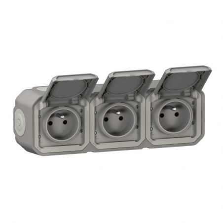 Marque: LegrandRéférence CME: LG070014EAN: 3414971904941Description: Plexo GP triple prise de courant à volet - précâblée horizontale - appareil complet avec boîte IP55 - gris