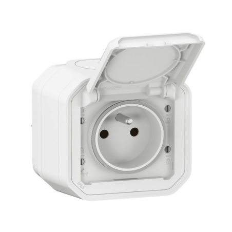 Marque: LegrandRéférence CME: LG070024EAN: 3414971905245Description: Plexo GP prise de courant à volet - appareil complet avec boîte IP55 - blanc