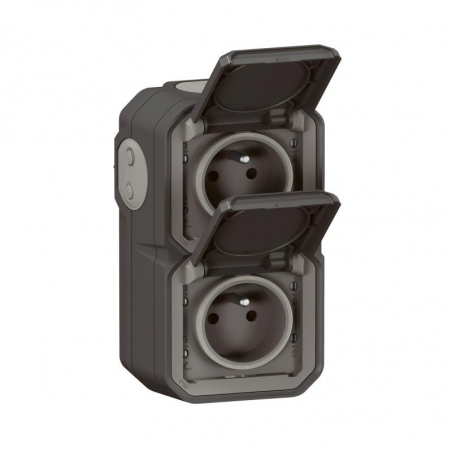 Marque: LegrandRéférence CME: LG070065EAN: 3414972108348Description: Plexo GP double prise de courant à volet 2P+T - précâblée verticale - appareil complet avec boîte IP55 - anthracite
