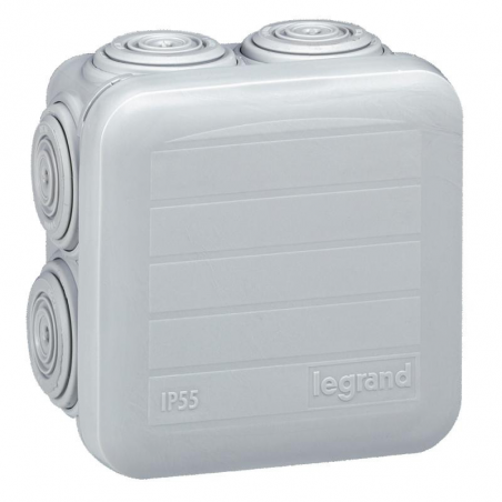 Marque: LegrandRéférence CME: LG092005EAN: 3245060920050Description: Boîte de dérivation carrée Plexo IP 55 - étanche - avec couvercle enclipsable - gris RAL 7035 - 7 embouts - dimensions 65 x 65 x 40 mm