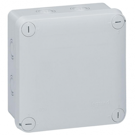 Description: Boîte de dérivation carrée Plexo IP 55 - étanche - gris RAL 7035 - 7 entrées pour PE ISO 16/20 - fermeture du couvercle par 1/4 de tour - dimensions 105x105x55 mm