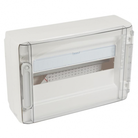 Description: Coffret saillie XL³ 125 - 1 rangée de 18 modules - 18 modules - avec porte transparente - IP40 - IK 09 - blanc RAL 9003 - chassis extratible et pivotant