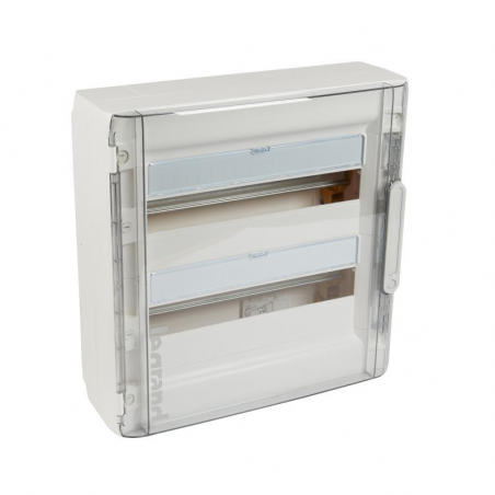 Description: Coffret saillie XL³ 125 - 2 rangées de 18 modules - 36 modules - avec porte transparente - IP40 - IK 09 - blanc RAL 9003 - chassis extratible et pivotant