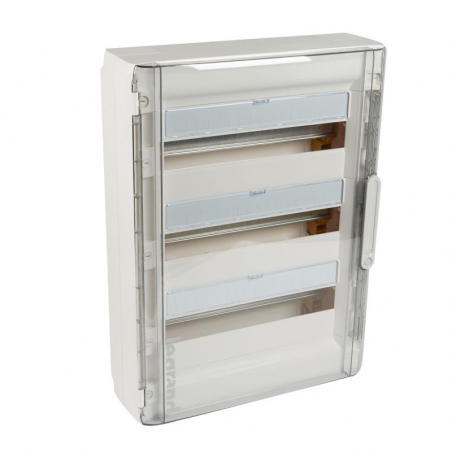 Description: Coffret saillie XL³ 125 - 3 rangées de 18 modules - 54 modules - avec porte transparente - IP40 - IK 09 - blanc RAL 9003 - chassis extratible et pivotant