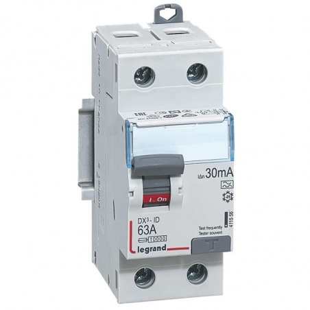 Marque: LegrandRéférence CME: LG411556EAN: 3245064115568Description: Interrupteur différentiel DX³ 2P 30mA 63A Type A - 2 modules