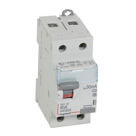 Marque: LegrandRéférence CME: LG411557EAN: 3245064115575Description: Interrupteur différentiel DX³ 2P 30mA 80A Type A - 2 modules