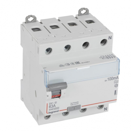 Marque: LegrandRéférence CME: LG411771EAN: 3245064117715Description: Interrupteur différentiel DX³ 4P 100mA 63A Type A - 4 modules