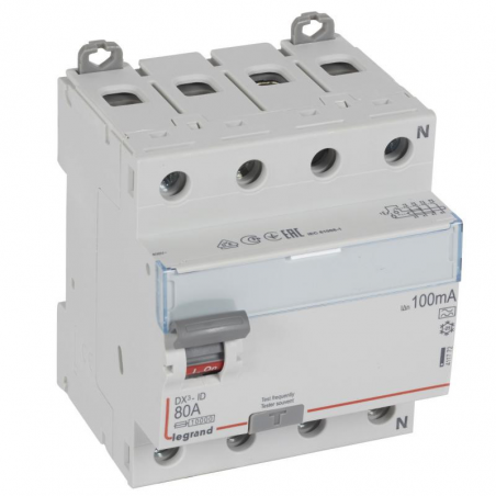Marque: LegrandRéférence CME: LG411772EAN: 3245064117722Description: Interrupteur différentiel DX³ 4P 100mA 80A Type A - 4 modules