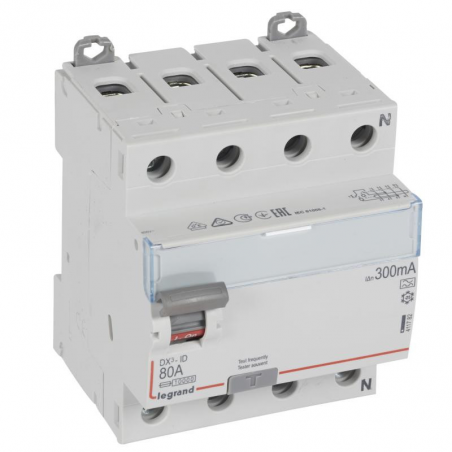 Marque: LegrandRéférence CME: LG411782EAN: 3245064117821Description: Interrupteur différentiel DX³ 4P 300mA 80A Type A - 4 modules