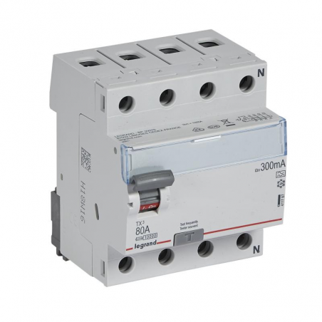 Marque: LegrandRéférence CME: LG411787EAN: 3414970352262Description: Interrupteur différentiel TX³ 4P 300mA 80A Type A - 4 modules - convient pour des installations domestiques