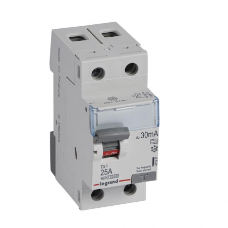 Marque: LegrandRéférence CME: LG411911EAN: 3414970354020Description: Interrupteur différentiel TX³ 2P 30mA 25A Type A - 2 modules - convient pour des installations domestiques