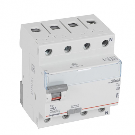 Marque: LegrandRéférence CME: LG411931EAN: 3414970354181Description: Interrupteur différentiel TX³ 4P 30mA 25A Type A - 4 modules - convient pour des installations domestiques