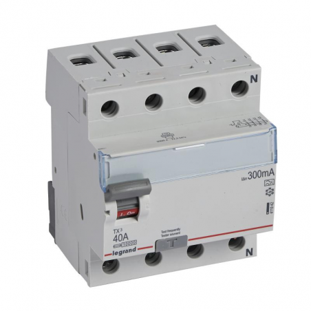 Marque: LegrandRéférence CME: LG411942EAN: 3414970354303Description: Interrupteur différentiel TX³ 4P 300mA 40A Type A - 4 modules - convient pour des installations domestiques