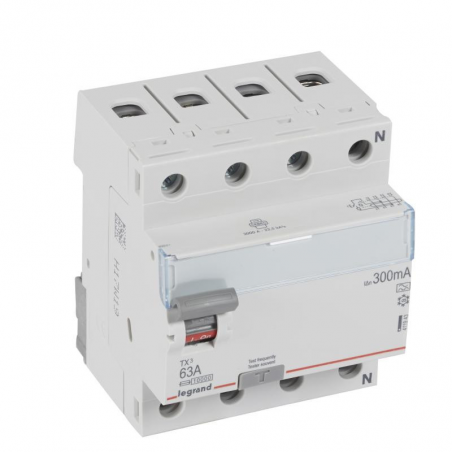 Marque: LegrandRéférence CME: LG411943EAN: 3414970354327Description: Interrupteur différentiel TX³ 4P 300mA 63A Type A - 4 modules - convient pour des installations domestiques