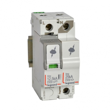 Marque: LegrandRéférence CME: LG412276EAN: 3414970517487Description: Parafoudre 1P+N - 12.5kA -T1/2 1.5kV - 320V - 2 modules