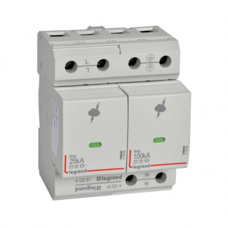 Marque: LegrandRéférence CME: LG412281EAN: 3414970517265Description: Parafoudre modulaire T1 - 1P+N - 25 et 35kA - 1.5kV - Uc 350V - 4 modules