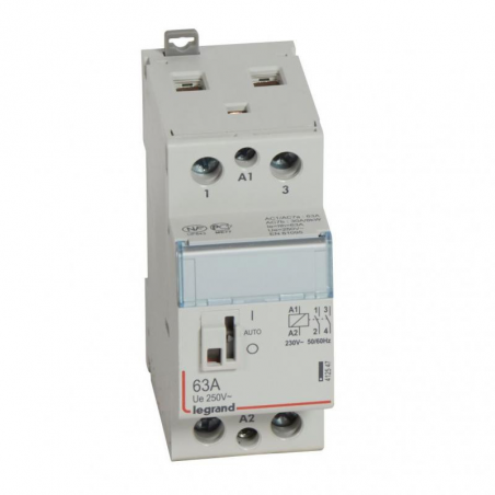 Marque: LegrandRéférence CME: LG412547EAN: 3245064125475Description: CX³ contacteur de puissance bobine 230V - bipolaires 250V - 63A - 2NO - 2 modules - manette accessible après ouverture de l'obturateur