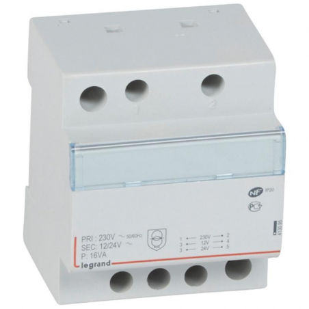 Marque: LegrandRéférence CME: LG413095EAN: 3245064130950Description: Transformateur pour sécurité 12/24V - 16VA 4 modules