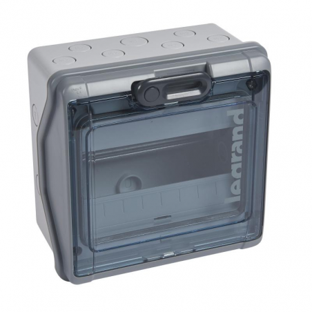 Marque: LegrandRéférence CME: LG601958EAN: 3245066019581Description: Plexo³ Coffret de distribution étanches 2 à 8 modules - 1 rangée - 8 modules de 17,5 mm - IP65 - IK09