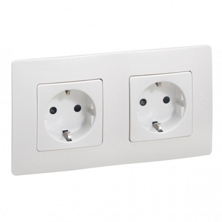 Marque: LegrandRéférence CME: LG664746EAN: 3245066647463Description: Niloé prise 2x2P+T schuko 16A précâblée à bornes auto blanc à vis