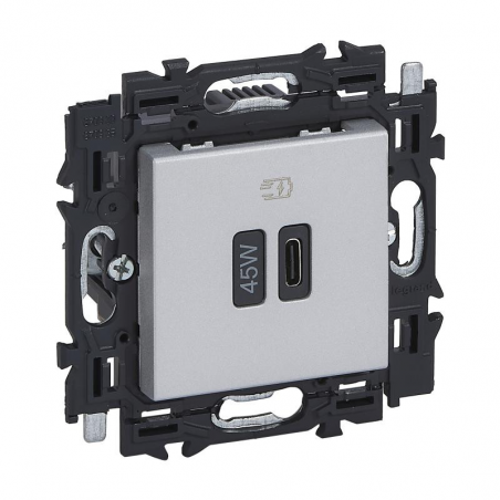 Marque: LegrandRéférence CME: LG741639EAN: 3414972510318Description: Valena Next chargeur USB type C - 45W - Power Delivery - appareil complet à griffes - fintion aluminium