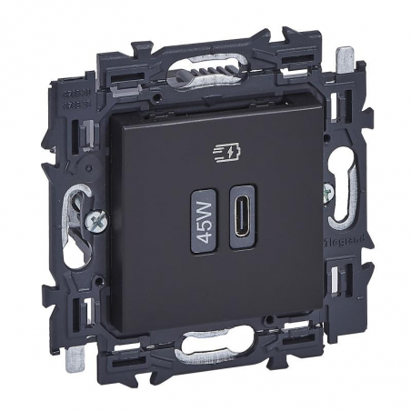 Marque: LegrandRéférence CME: LG741739EAN: 3414972510332Description: Valena Next chargeur USB type C - 45W - Power Delivery - appareil complet à griffes - fintion noir