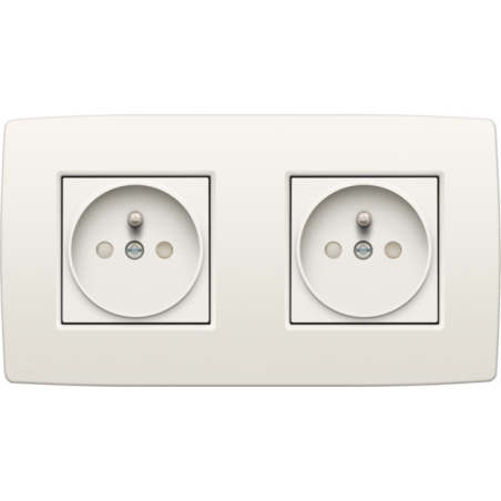 Description: Prise de courant double horizontale avec broche de terre et obturateurs de protection, bornes à vis, profondeur dencastrement de 21 mm, y compris plaque de recouvrement, couleur white