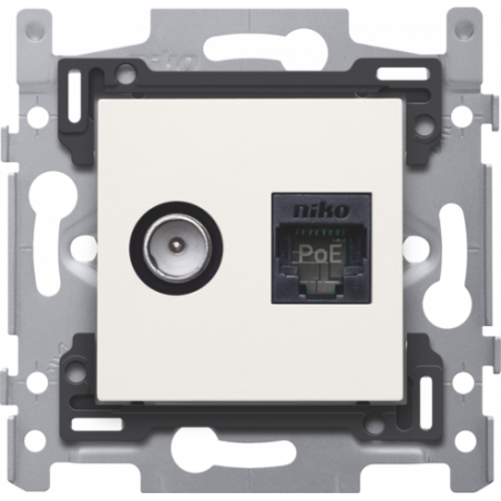 Description: Combinaison coax avec connexion RJ45 UTP Cat. 6A, prêt pour l'alimentation PoE++, modèle plat, incl. socle 60 x 71 mm avec fixation par griffes et set de finition, agréation Wyre (Telenet-Interkabel) et VOO, couleur white