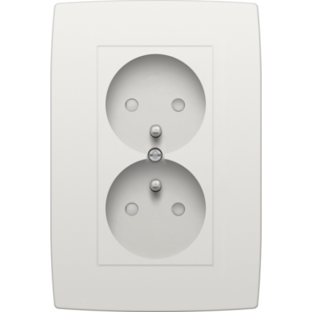 Description: Prise de courant double verticale avec broche de terre et obturateurs de protection, profondeur dencastrement de 24 mm, appareil complet, y compris plaque de recouvrement, couleur white