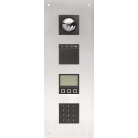 Marque: NikoRéférence CME: N10386EAN: 5413736345805Description: Poste extérieur vidéo modulaire à encastrer comprenant 4 modules : caméra dôme, audio, écran et serrure à code