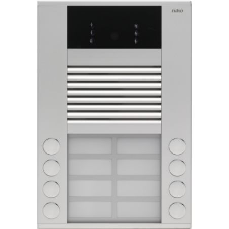 Marque: NikoRéférence CME: N10408EAN: 5413736161184Description: Poste extérieur pour montage en saillie 20 mm avec 8 sonnettes en deux rangées et caméra couleur
