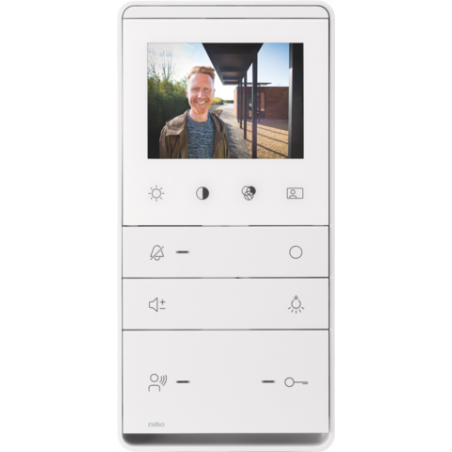 Marque: NikoRéférence CME: N10577EAN: 5413736371309Description: Poste intérieur vidéo fin pour montage en saillie, avec écran couleur et boutons-poussoirs tactiles.
